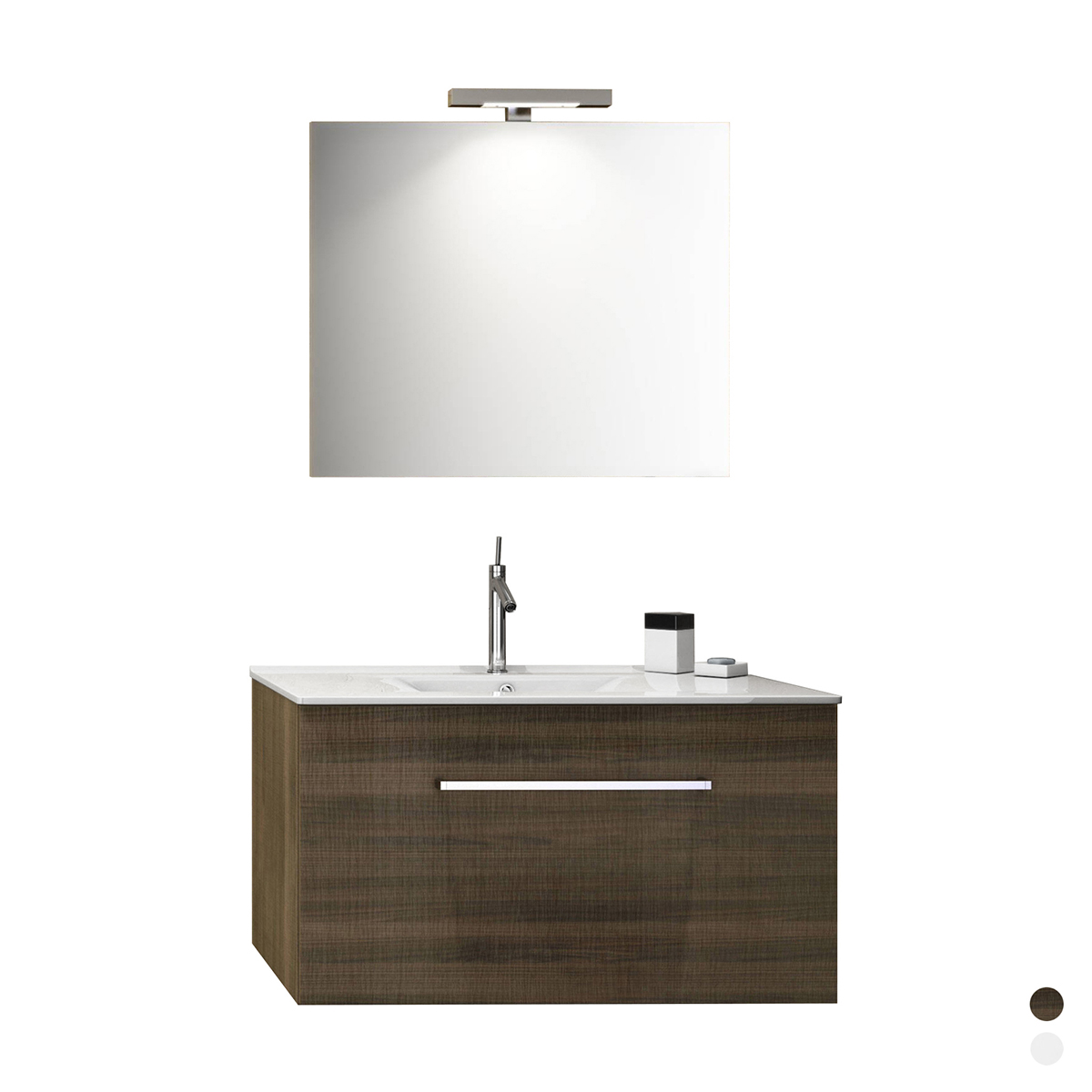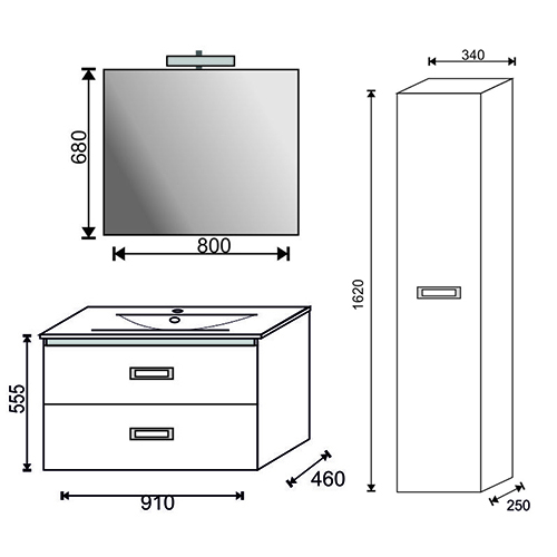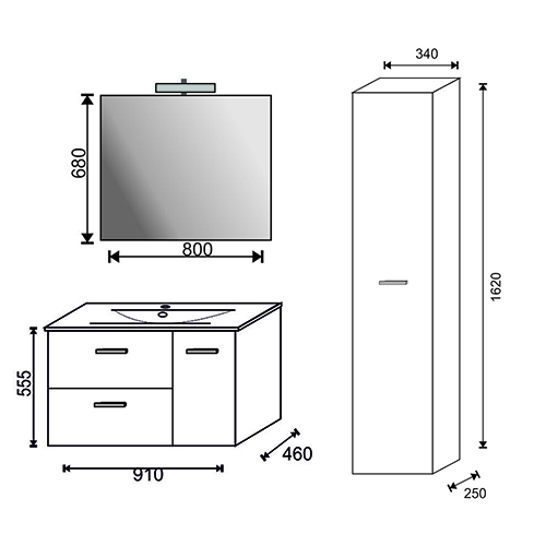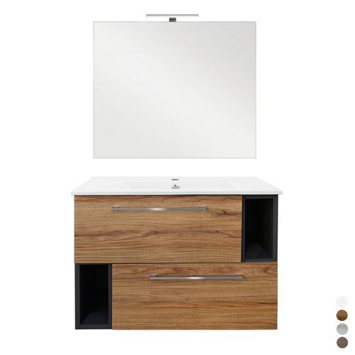 Dimensione mobile: LxHxP =910x555x460 – Dimensioni specchio: LxH = 800×680. Lavabo in ceramica e cassetto con chiusura ammortizzata.