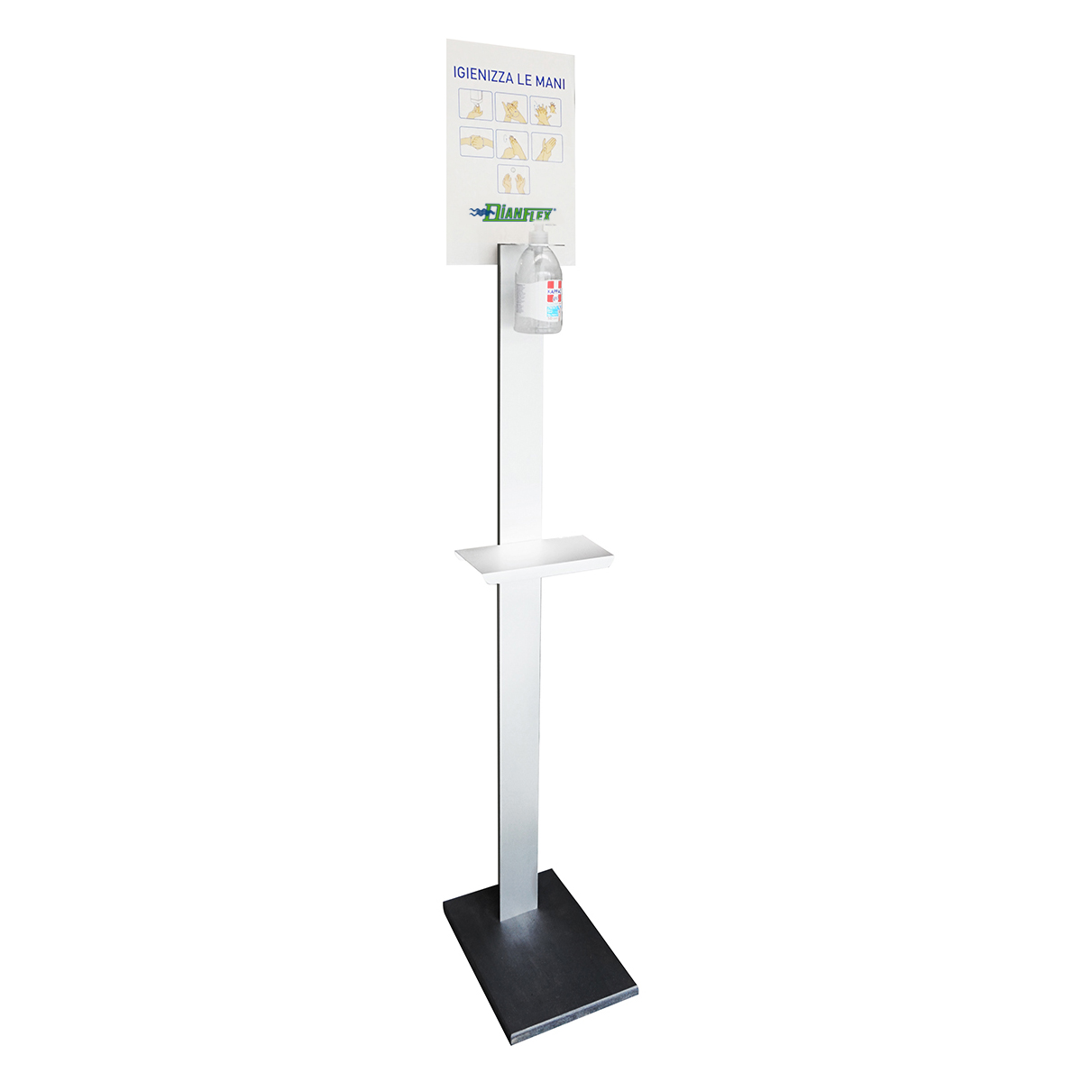 Colonnina Porta Gel Igienizzante Con Mensola Per Guanti In Alluminio Hxlxp Cm 160x24x35