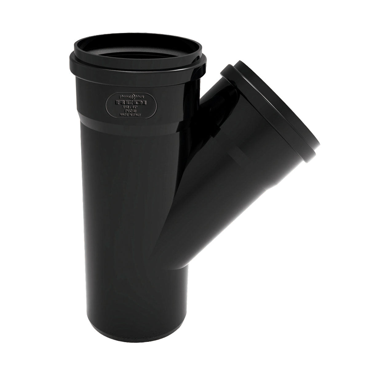 Sistema di scarico fonoisolante a innesto in PVC nero. Certificazione acustica 13dB a 2l/s.