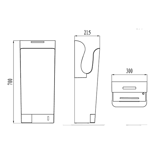 Potenza massima 2050W – Asciuga le mani in 7 – 10 secondi. Velocità dell’aria 95 m/s. Motore DC brushless ad alta velocità. Temperatura aria 20 ~ 40 °C. Accensione e spegnimento del riscaldamento automatico. Due velocità della ventola selezionabile. Serbatoio raccolta acqua svuotabile (700 ml). Filtro HEPA. Display a LED. Scocca esterna in ABS ad alta resistenza. Classe di protezione IP24. Bassa rumorosità (70dB@1 m). Spegnimento automatico dopo 25s di uso continuo. Peso 9,5 kg. Dimensioni: h 700 x 300 x 215. 220-240V, 50/HZ. Classe di isolamento I