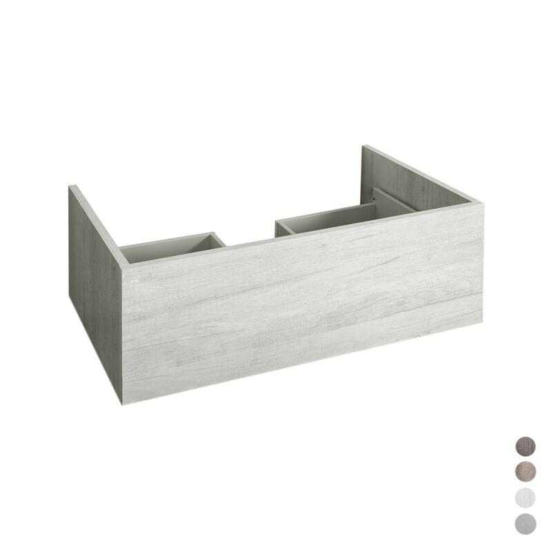 Base sospesa realizzata in nobilitato da 1,8 cm. Senza top a 1 cassetto apertura a push e chiusura rallentata. Con vano sifone.