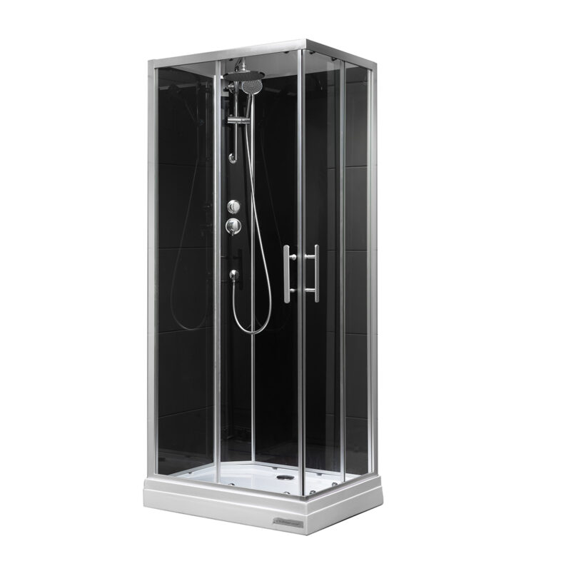 Cabina doccia composta da: vetri frontali temperati trasparenti. piatto doccia in ABS altezza 13,5 cm con frontale ispezionabile. profili cromati satinati. pannelli doccia ad angolo in vetro nero o bianco. Accessori cromati inclusi: doccetta a tre funzioni. soffione con braccio. laccio doccia 1,5 m. miscelatore doccia. deviatore. Spessore vetro 5 mm. Senza tettuccio per cabina doccia.