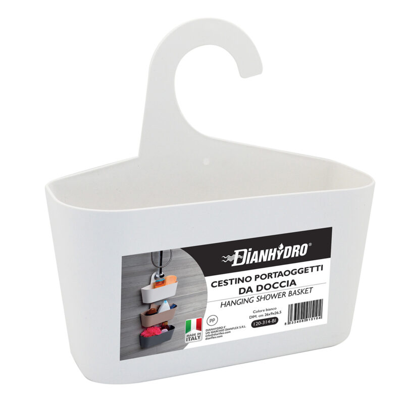Dimensioni: 26x9x26,5 cm. Pratico cestino portaoggetti da doccia con gancio. In Duroplast. Made in Italy