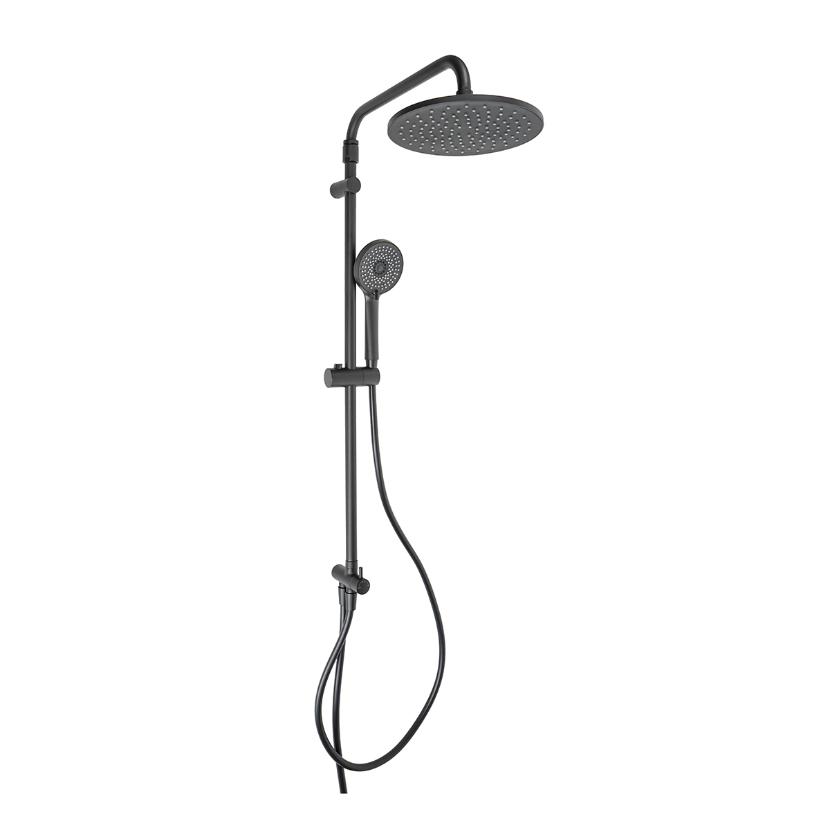 Materiali: Acciaio verniciato e ABS. Soffione Diam. 23 cm . Doccetta Diam. 11 cm. – H 94,5/130 cm. Asta doccia regolabile.