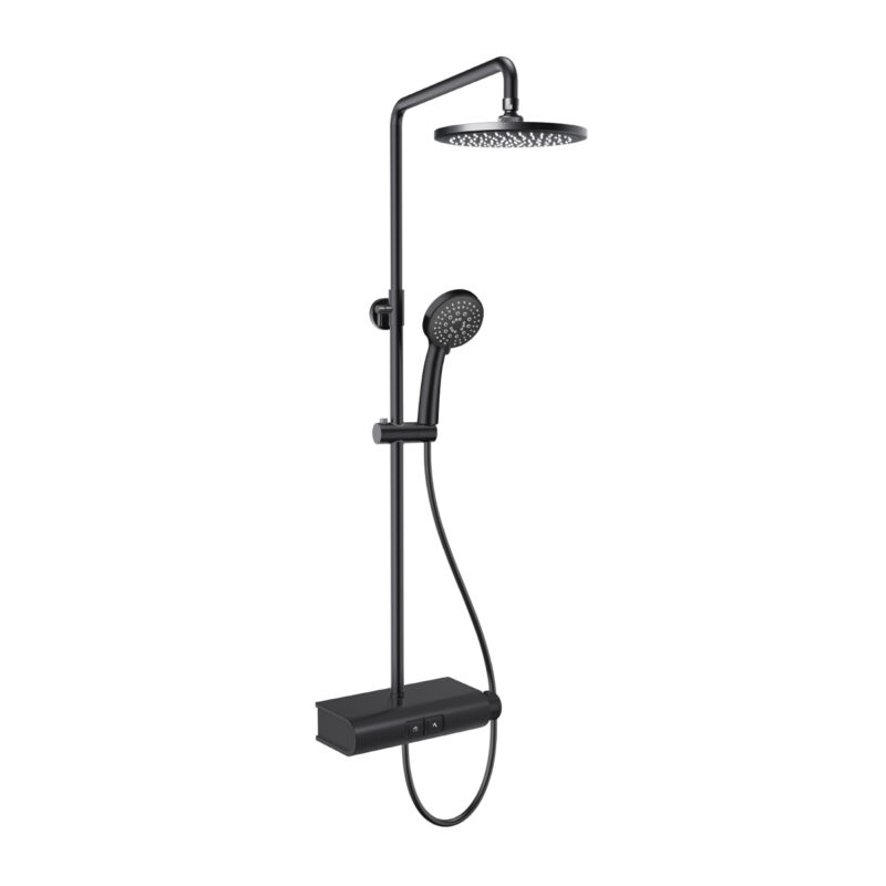 Colonna doccia in acciaio inox, ottone e ABS composta da: soffione tondo monogetto diam. 228 mm, doccetta 5 getti, supporto doccetta. Flessibile doccia lunghezza 1500 mm in PVC, a doppia aggraffatura. Asta scorrevole con interasse regolabile (H: 840-1200mm). Anticalcare e con pulsante per passare da soffione a doccetta. Disponibile in 2 finiture: Bianco e Nero. Ingombro totale 29,3 cm