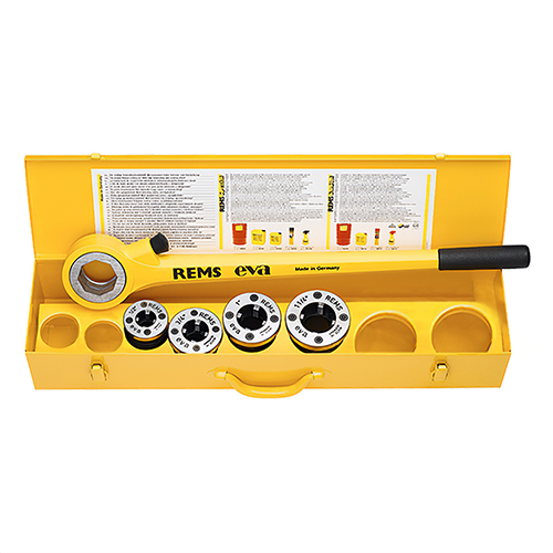 Filiera a cricco con bussole a cambio rapido. Per filettatura tubi 1/8 – 2″, 16 – 50 mm, filettatura bulloni 6 – 30 mm,1/4 – 1″. Per filettatura destra e sinistra. 1 leva a cricco per l’intera capacità. Bussole a cambio rapido con pettini per filettatura tubi passo gas conico ISO 7-1, EN 10226 (DIN 2999, BSPT) R destra. In robusta cassetta metallica.