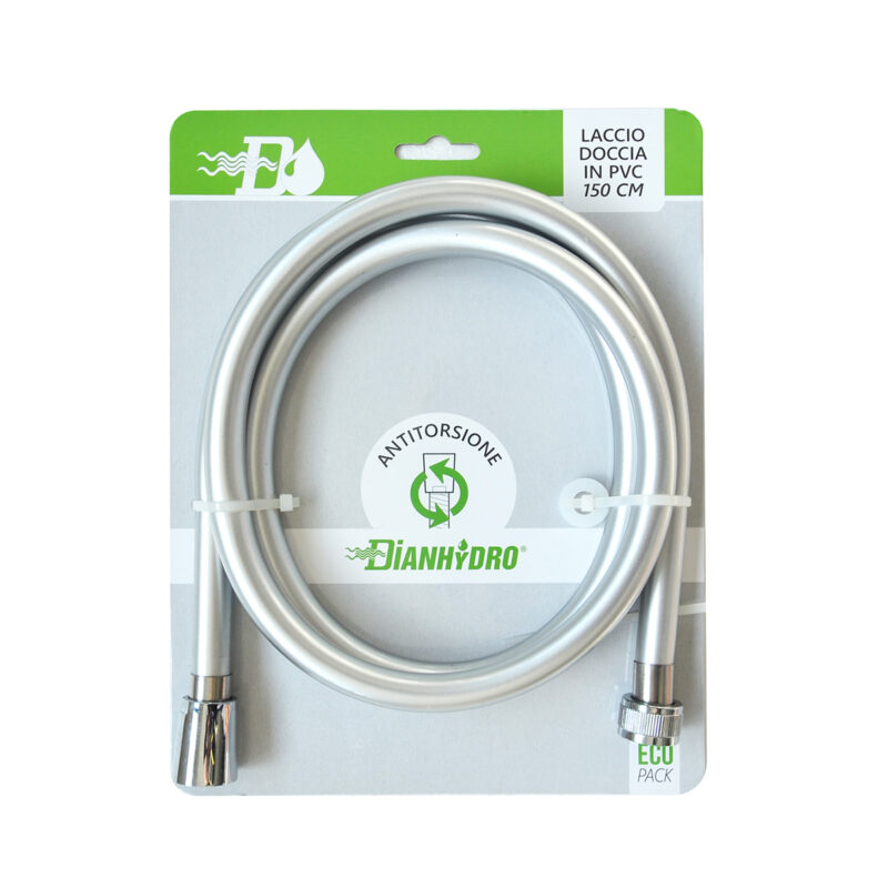 Flessibile doccia in PVC, lunghezza 150 cm, 1 dado conico antitorsione in ottone, tubo interno in PVC.