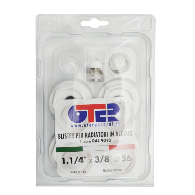 Kit per radiatori in acciaio comprese di valvolino. Composto da n. 2 riduzioni con incavo flangia DX con guarnizione. n. 2 riduzioni con incavo flangia SX con guarnizione. n.1 tappo in ottone cromato con cappuccio bianco e guarnizione ORING. n. 1 valvola sfogo aria in ottone cromata con guarnizione montata e anello di chiusura in Teflon. Verniciatura a polvere bianco RAL 9010 e RAL 9016 su base zincata. Le guarnizioni sono O-RING in EPDM.