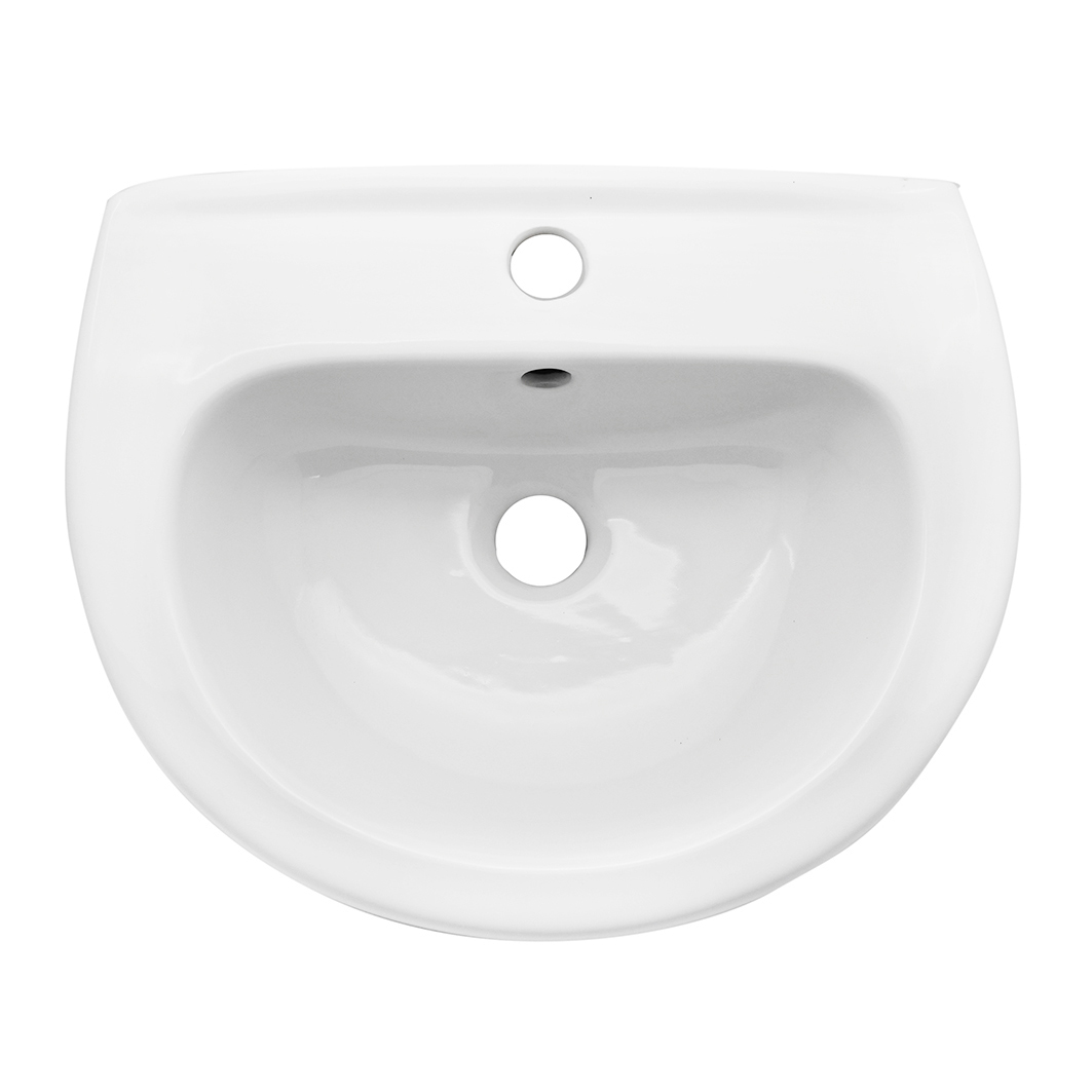 In ceramica bianca. Con foro per monocomando e troppo pieno.