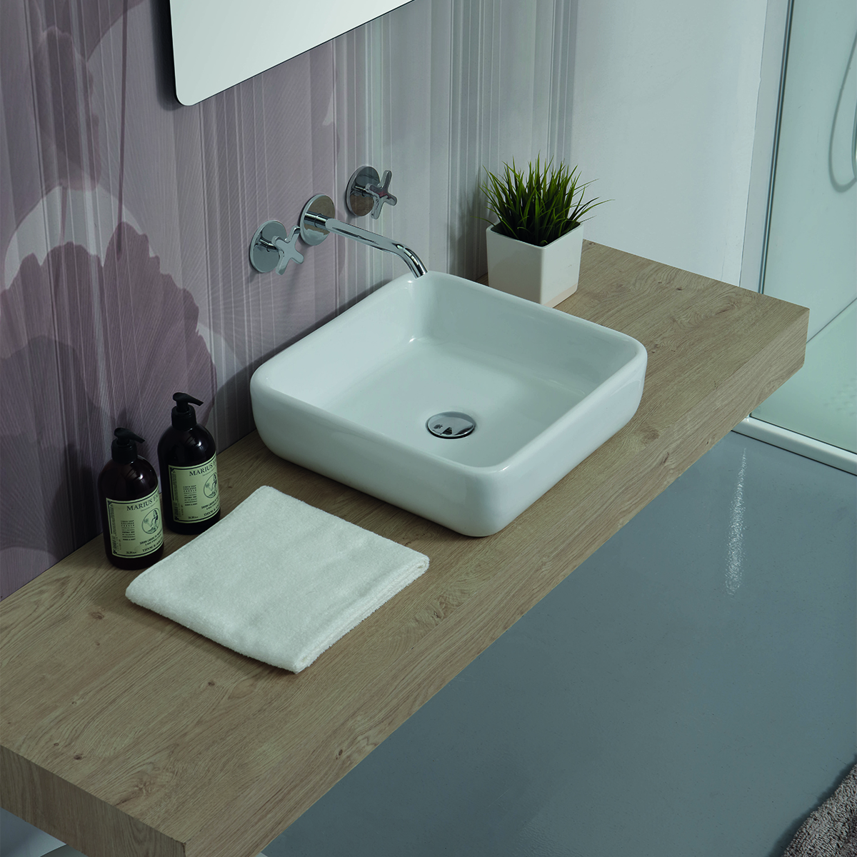 Lavabo in ceramica (nome tecnico: Vitreous China, Porcellana Vitrea o anche Porcellana Sanitaria) senza troppo pieno. Installazione ad appoggio. Piletta non inclusa. Altezza cm 12. Colore bianco.