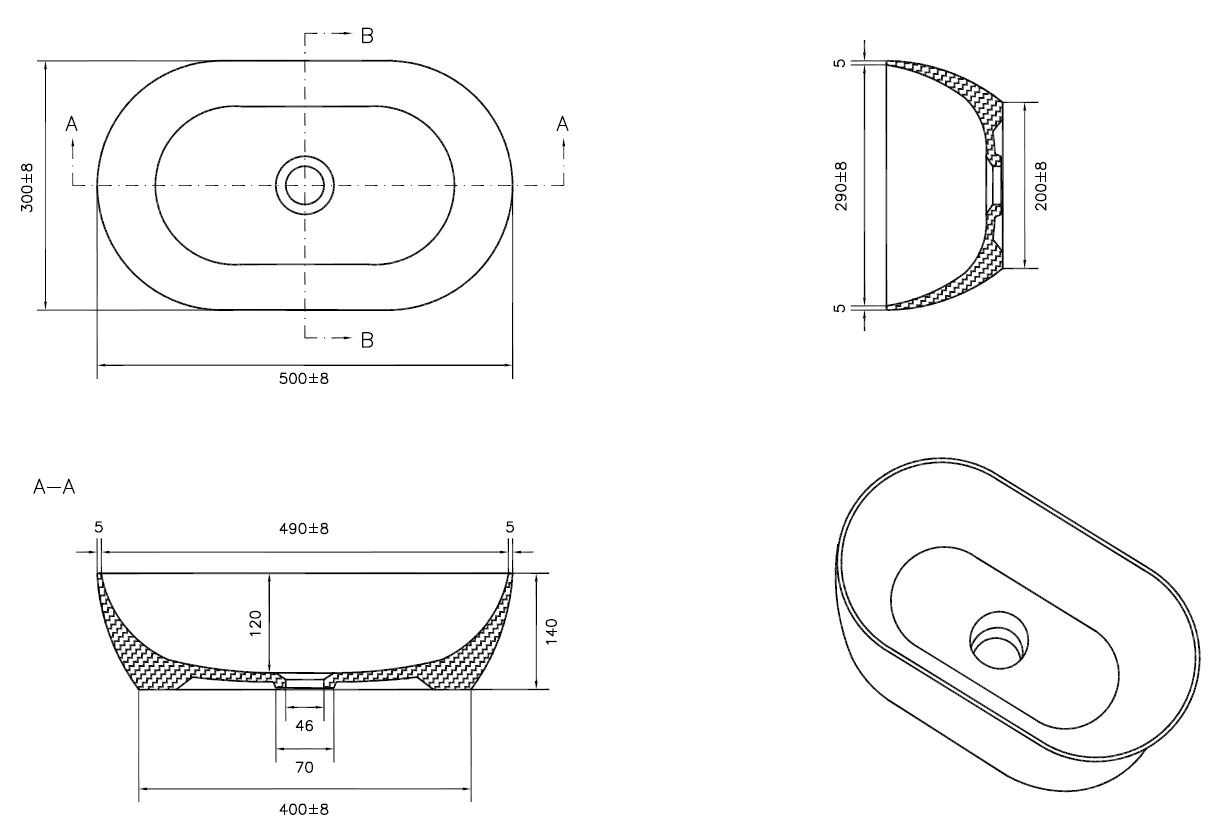 Lavabo in ceramica (nome tecnico: Vitreous China, Porcellana Vitrea o anche Porcellana Sanitaria) senza troppo pieno. Installazione ad appoggio. Piletta non inclusa. Altezza cm 14. Colore bianco.