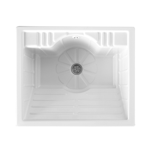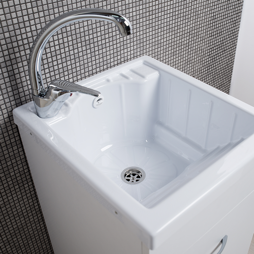 Combinazione di mobile in nobilitato idrofugo sp 18 mm e vasca in ABS. Lavatoio con asse di lavaggio incorporato nella vasca, completo di sifone e piletta. Ampia vasca di lavaggio con spazio per riporre un secchio. Vasca forabile per installazione rubinetto. Colore bianco opaco. Profondità vasca 23 cm. Altezza piedini 14 cm.