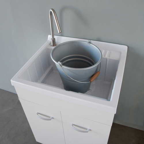 Combinazione di mobile in nobilitato idrofugo sp 18 mm e vasca in ABS. Lavatoio con asse di lavaggio incorporato nella vasca, completo di sifone e piletta. Ampia vasca di lavaggio con spazio per riporre un secchio. Vasca forabile per installazione rubinetto. Colore bianco opaco. Profondità vasca 23 cm. Altezza piedini 14 cm.