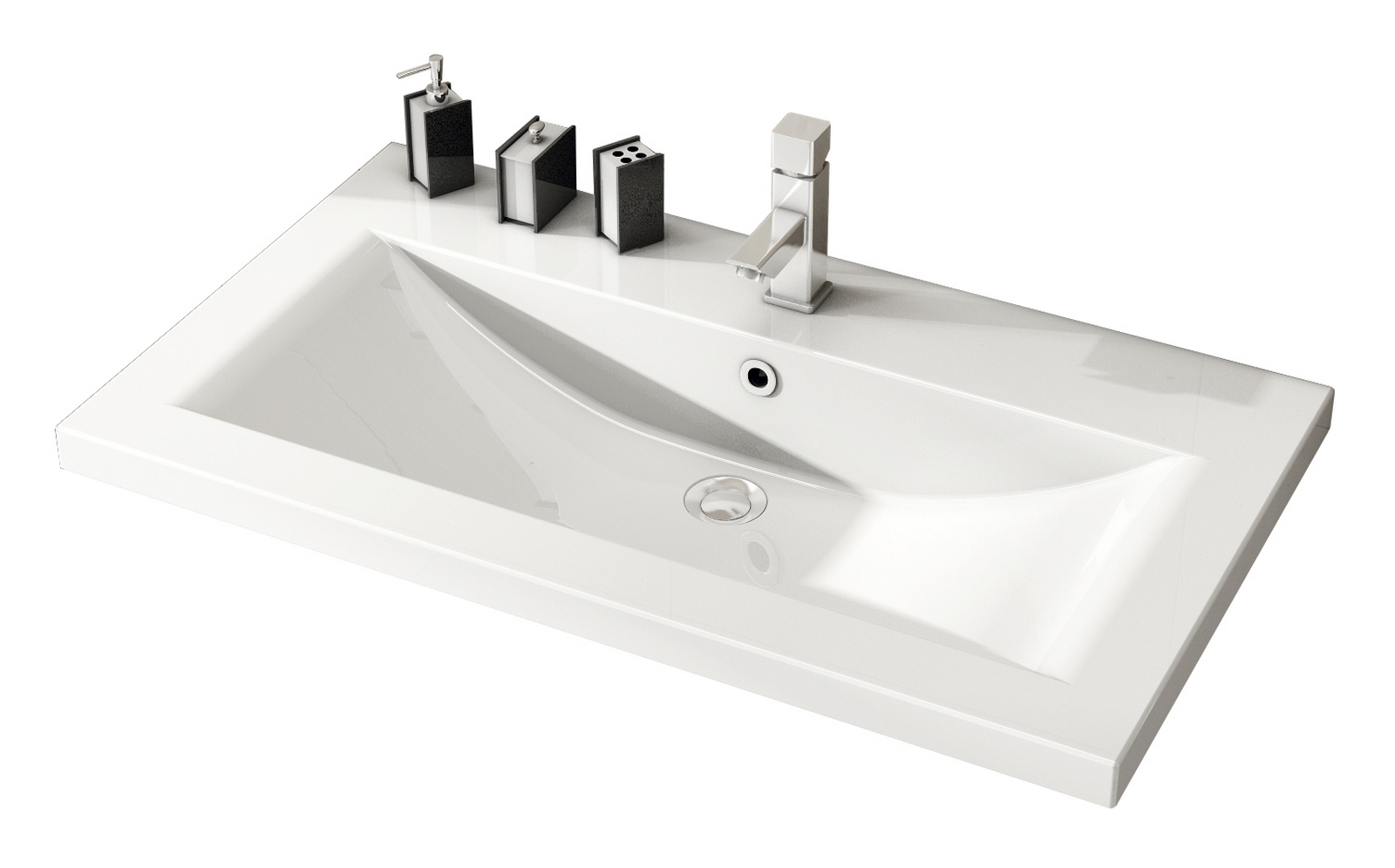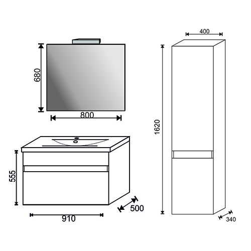 Dimensione mobile: LxHxP =915x555x500 – Dimensioni specchio: LxH = 800×680. Lavabo in mineralmarmo bianco lucido e cassetto con chiusura ammortizzata.
