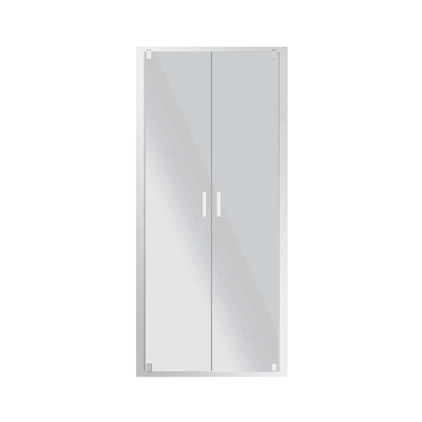 Doppia porta doccia a battente con profili nelle finiture cromo satinato o nero e vetro cristallo. Il profilo basso è più sottile di quello alto e funge da barriera per l’acqua. Altezza 200 cm. Doppia maniglia cromata. Installabile con la parete fissa linea Velvet o in nicchia. Prodotto fabbricato conforme agli standard EN 14428:2004. Doppia porta doccia a battente regolabile in larghezza +5 cm / -5 cm.