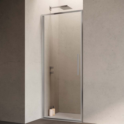 Parete doccia con apertura a porta battente. Cristallo 6 mm. Altezza 200 cm. Disponibili nelle versioni: Profilo cromo vetro trasparente – Profilo cromo vetro stampato – Profilo Nero vetro trasparente.
