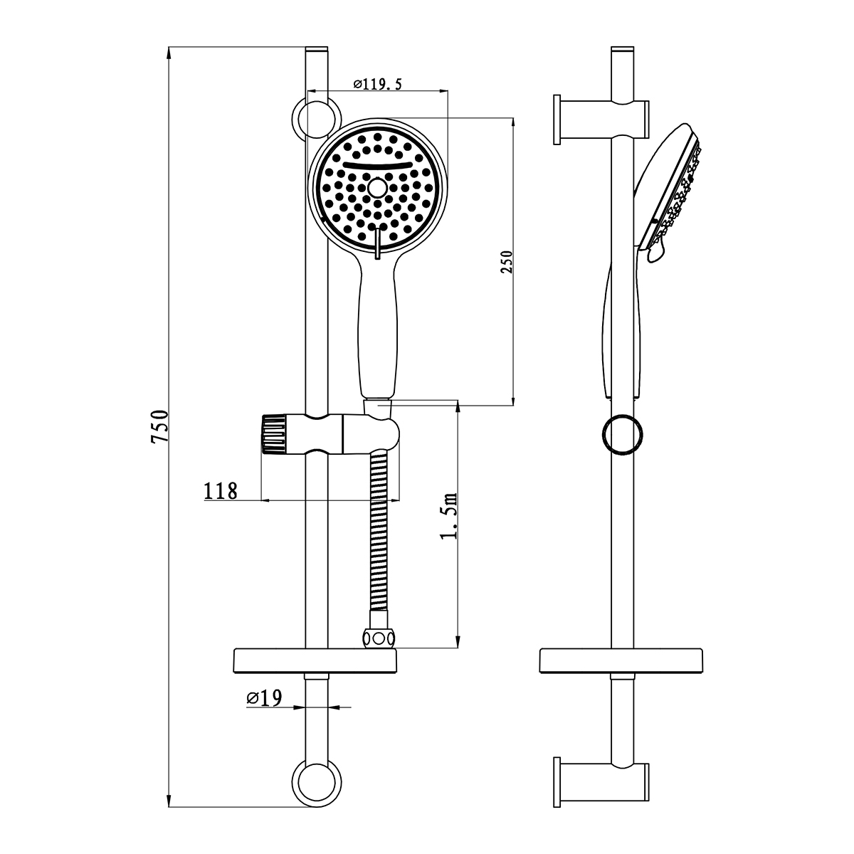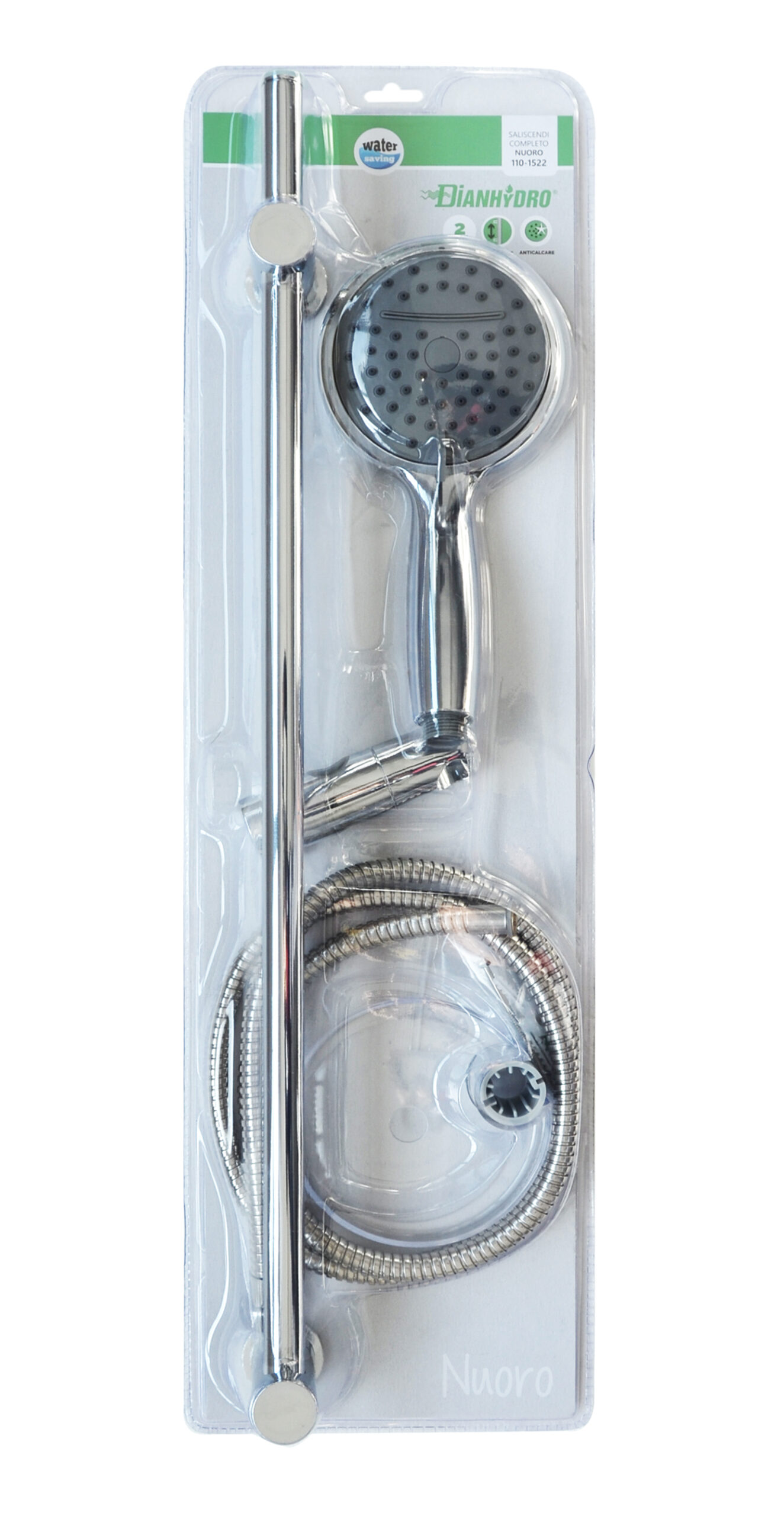 Saliscendi doccia composto da: doccetta 2 getti diametro 119,5 mm, con water saving. Laccio doccia lungh. 150 cm in acciaio inox. Supporto superiore regolabile. Asta doccia in acciaio inox diametro 19 mm, con porta sapone. Altezza totale 64,5 cm. Finitura cromata.