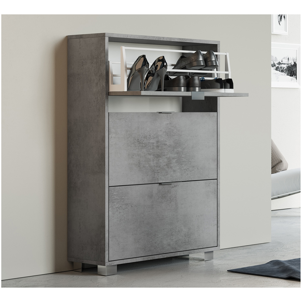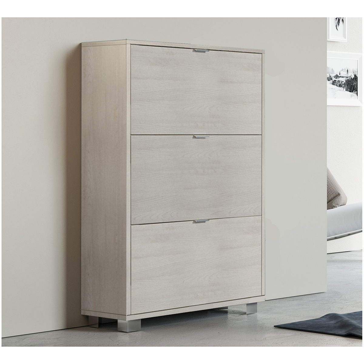 Scarpiera 3 ribalte con doppia griglia, piedini cromati. Composta da truciolare nobilitato spessore mm 16. Fornito di n.4 piedini con viti di fissaggio.