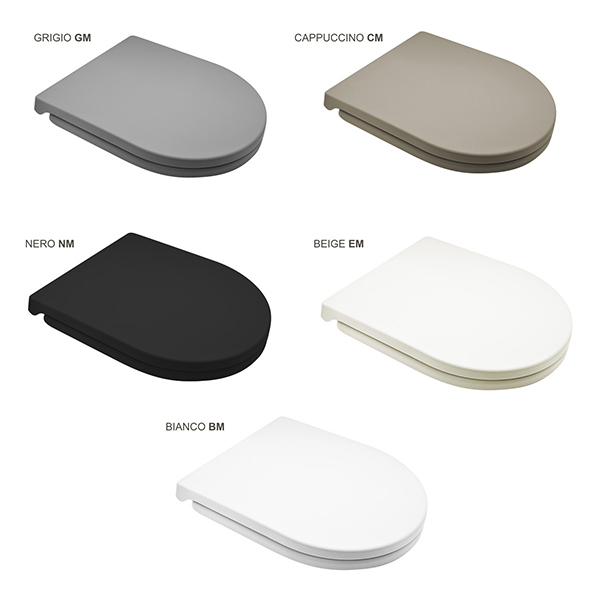 Sedile in termoindurente (Forma tipo 7) dedicato a casa ceramica RAK serie Feeling. Dimensioni: Lunghezza cm 39-43. Larghezza cm 36,5. interasse cerniere cm 12,5-14,5. Mod. con cerniere regolabili tipo C. Sgancio rapido. Soft Closing.