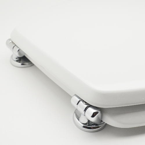 Sedile (Forma tipo 1 – cerniere tipo A) dedicato a casa ceramica Pozzi Ginori serie Piemontesina. Dimensioni: Lunghezza cm 43-46. Larghezza cm 35. Interasse cerniere cm 13,3-18 . mod. con cerniere regolabili. Sedile in legno stabilizzato, colato in poliestere. Cerniere in ottone cromato e viti di fissaggio in acciaio inox.
