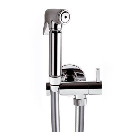 Composto da: idroscopino, flessibile conico 120 cm metallizzato in PVC, rubinetto ad angolo con vitone ceramico e supporto “lux” in ottone cromato.