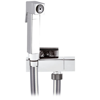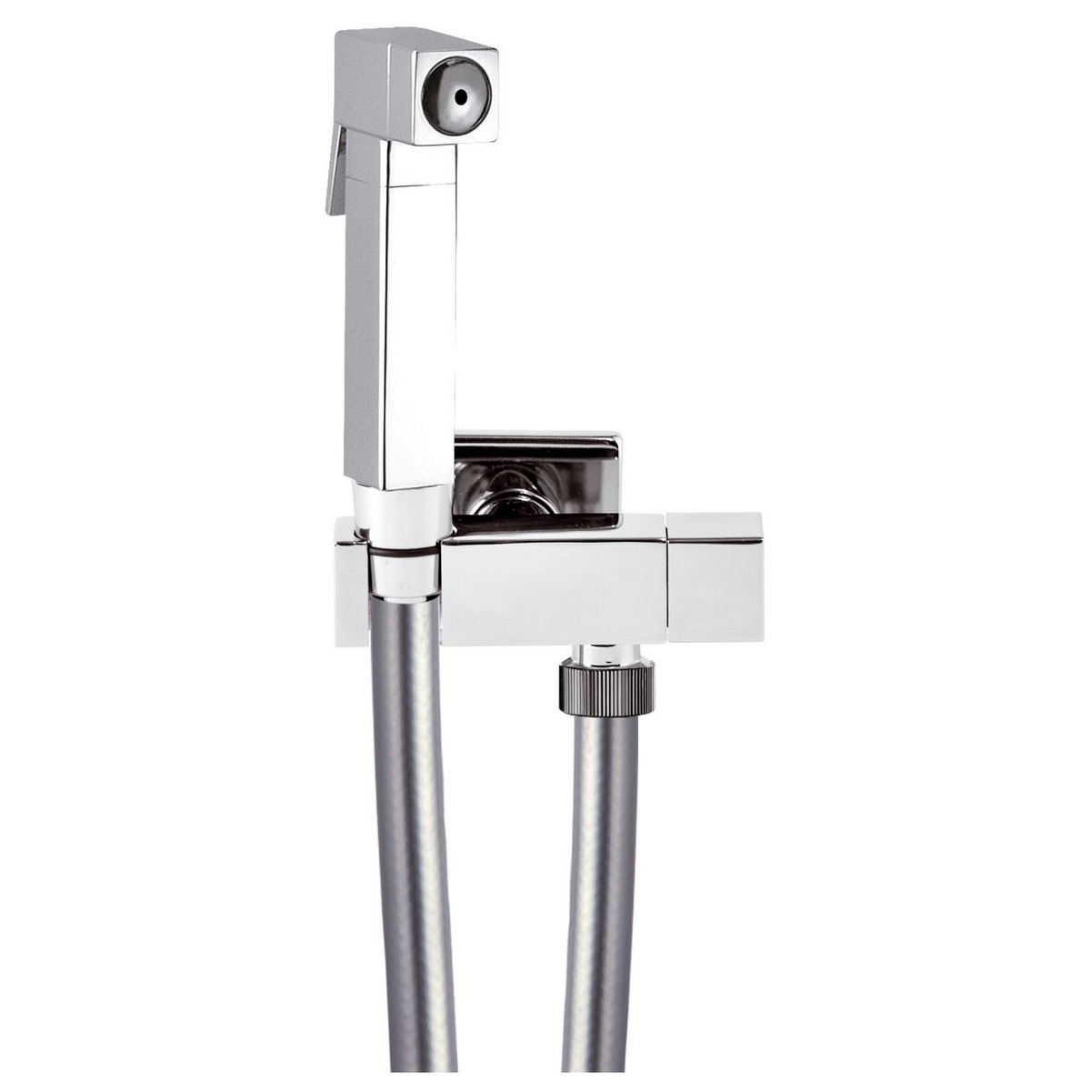 Set idroscopino composto da: idroscopino “SQ”, flessibile conico 120 cm metallizzato in PVC, rubinetto ad angolo con vitone e supporto “Lux” in ottone cromato.