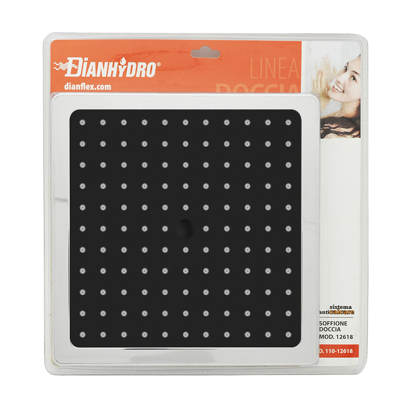 Soffione monogetto. Dimensioni 200x200mm. Con sistema anticalcare.