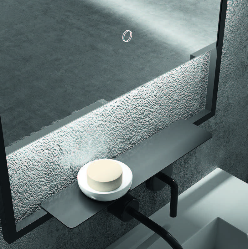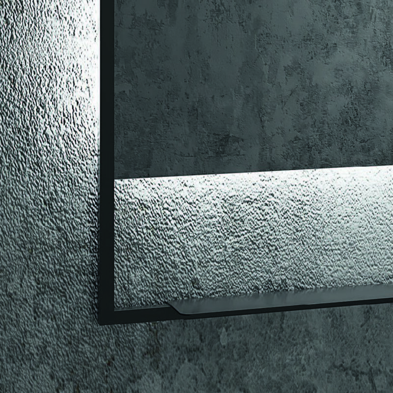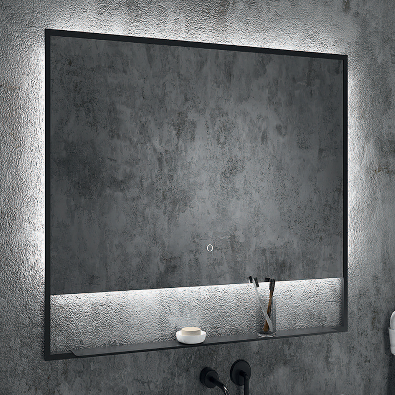 Specchio rettangolare con cornice in metallo e pellicola anti-rottura, led 4000K con accensione touch, retro-illuminato, installazione verticale.