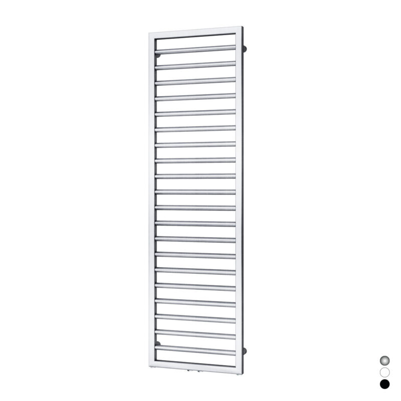 Radiatore scaldasalviette in acciaio con elementi tondi da 23 mm e cornice perimetrale con profilo quadrato da 30 x 30 mm. Pressione max di esercizio: 10,0 bar. Temperatura max di esercizio: 110°C. Certificazione EN442/EcoDesign, registrazione CE. Attacchi S012 centrale e laterale.